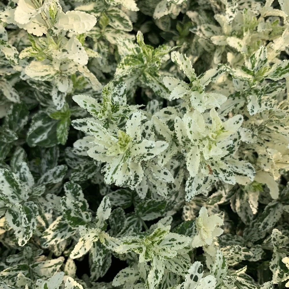 The newly emerging foliage of this tough, ground-covering semi-evergreen, is often mainly creamy white, and this means it really stands out against a sea of green in the border. As it becomes fully developed however, the green splotches become more predominant, but it still maintains attractive variegations. Then, as the temperatures start to drop, pink tinges creep into the mix, and these persist through the winter. A great gap-filler at the front of the border, it also makes a super plant for patio pots.