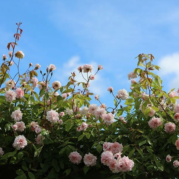 Tiny, hybrid T-shaped buds appear in clusters and open to sweetly scented, fully double, light pink flowers for a long period throughout summer. Well known for its prolific flowers, this vigorous climbing rose is a sport of the bush rose which shares its name. It has good disease resistance and is perfect for an open, sunny wall or large pergola. A cottage garden classic.