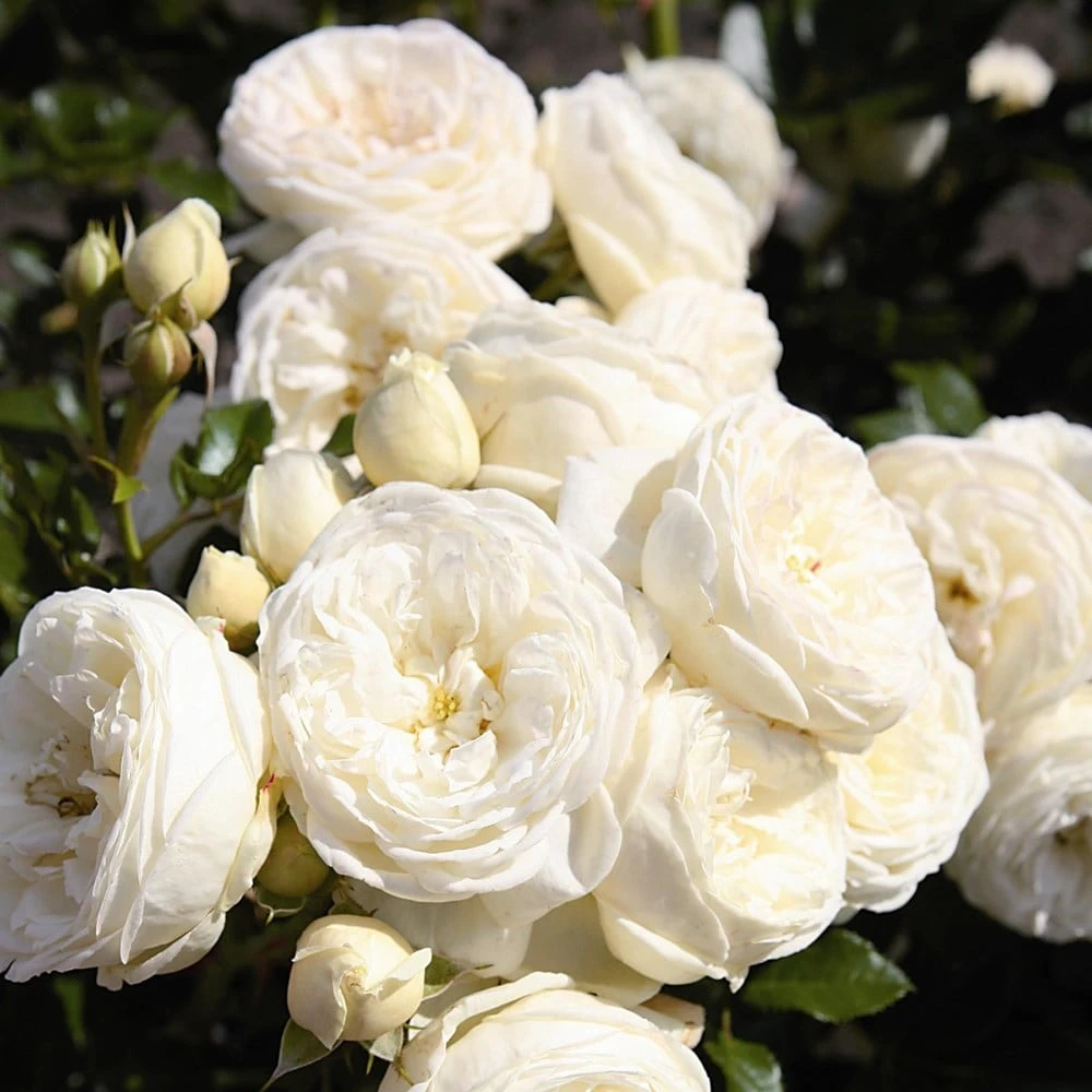 Beautiful ivory-white, fully double and quartered, fragrant flowers that are freely produced in clusters above glossy-green foliage. ‘Sweet Child of Mine’ is a compact, ‘floribunda’ with a hint of aniseed among its rosy-scented flowers which are borne upon sturdy stems. A great choice for a specimen rose in a suitably large pot or for white, and cottage garden-themed beds and borders.